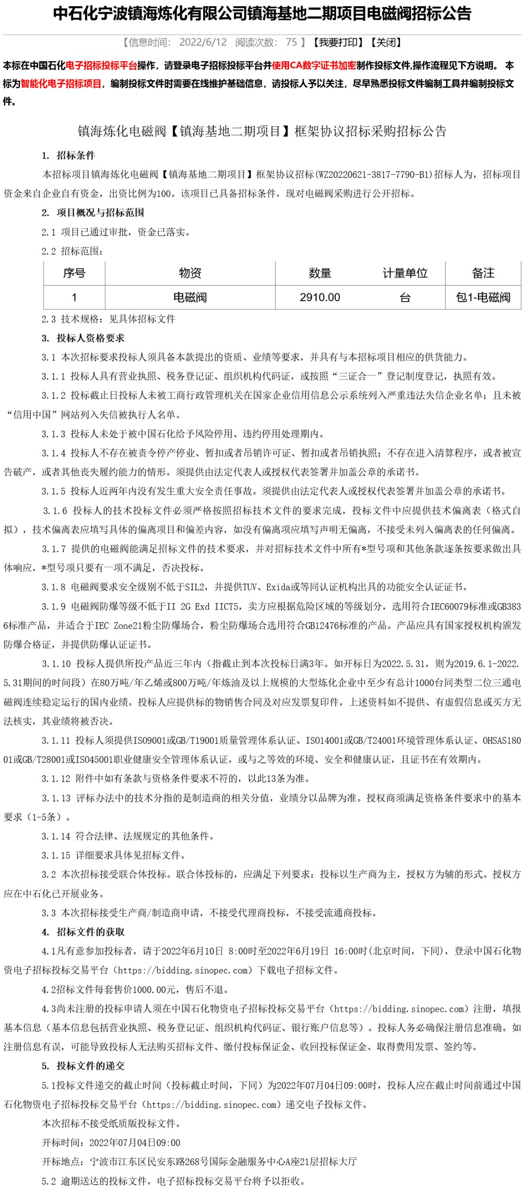 招標公告| 中石化寧波鎮(zhèn)海煉化有限公司鎮(zhèn)海基地二期項目電磁閥招標公告