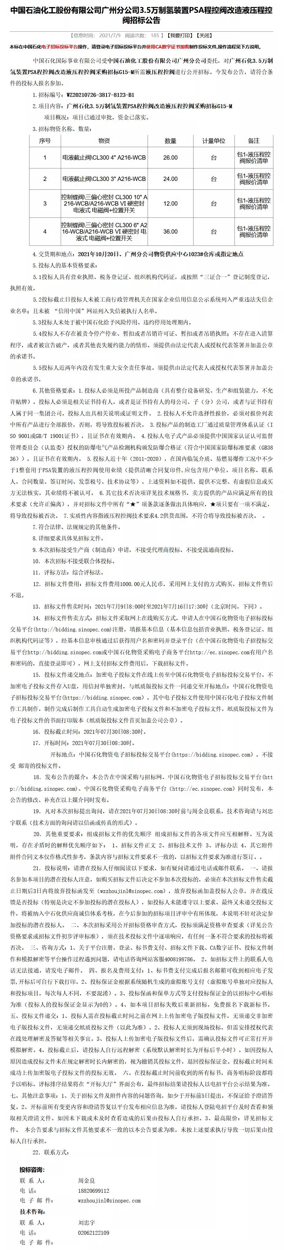 中國石化廣州分公司3.5萬制氫裝置PSA程控閥改造液壓程控閥招標公告