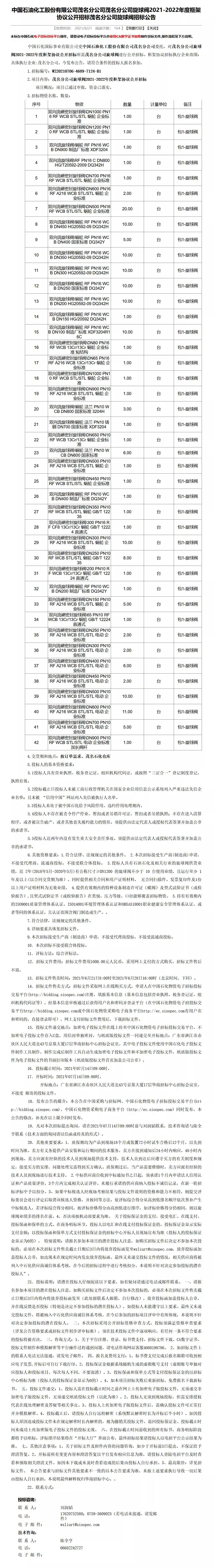 中國石化茂名分公司旋球閥2021-2022年度框架協議公開招標茂名分公司旋球閥招標公告