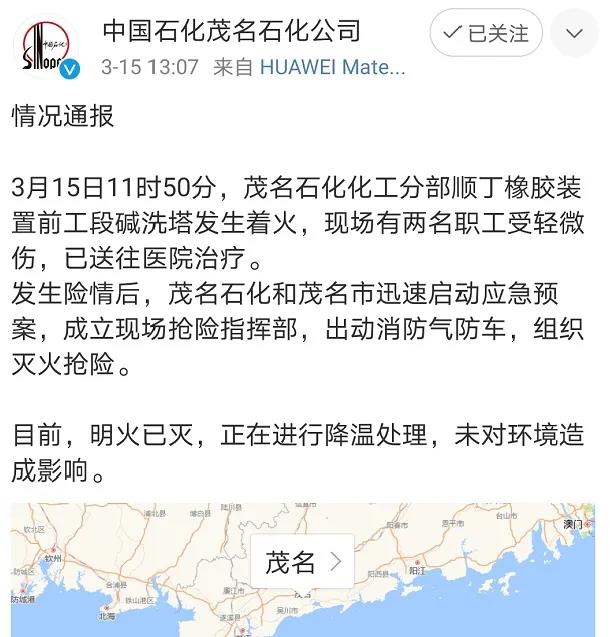 3月15日11時50分,茂名石化化工分部順丁橡膠裝置前工段堿洗塔發(fā)生著火,現(xiàn)場有兩名職工受輕微傷,已送往醫(yī)院治療。