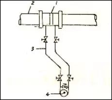 4.當(dāng)測量氣體流量時,測壓孔開在管道的上半部,差壓變送器應(yīng)安得高于孔板。當(dāng)無法滿足此要求時,必須在導(dǎo)壓系統(tǒng)最低處加冷凝和放水閥,以保證導(dǎo)壓管內(nèi)沒有液體。如圖3所示。