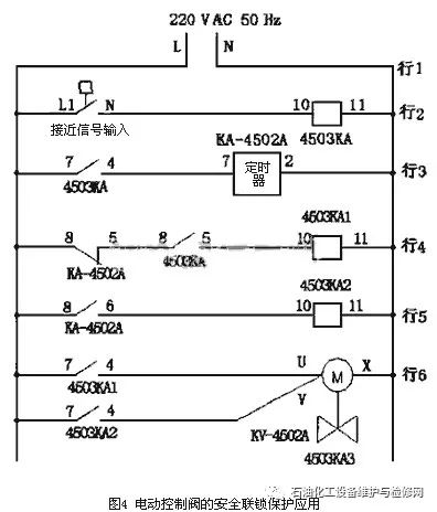 1.2電動(dòng)控制閥的安全聯(lián)鎖保護(hù)電動(dòng)控制閥的電動(dòng)執(zhí)行器是以220V交流單項(xiàng)電源作為驅(qū)動(dòng)電源,接受來(lái)自調(diào)節(jié)器的毫安信號(hào)或電壓控制信號(hào)來(lái)進(jìn)行工作的。現(xiàn)在國(guó)內(nèi)的電動(dòng)控制閥大多采用進(jìn)口的日本工裝電子式電動(dòng)執(zhí)行器,電子式控制單元常被設(shè)計(jì)成黑匣子形式,并用樹(shù)脂澆鑄,驅(qū)動(dòng)電機(jī)采用交流可逆電機(jī),可以正驅(qū)動(dòng)或反驅(qū)動(dòng);驅(qū)動(dòng)量的反饋檢測(cè)采用高性能的、高可靠性的電位器,以實(shí)現(xiàn)控制調(diào)節(jié)功能。切斷或調(diào)節(jié)電動(dòng)控制閥的安全聯(lián)鎖保護(hù)歸根結(jié)底是通過(guò)安全聯(lián)鎖信號(hào)對(duì)驅(qū)動(dòng)電機(jī)的驅(qū)動(dòng)電源的控制,以實(shí)現(xiàn)驅(qū)動(dòng)電機(jī)的正轉(zhuǎn)或反轉(zhuǎn),來(lái)達(dá)到對(duì)控制閥的打開(kāi)或關(guān)閉的目的。因此只要將安全聯(lián)鎖信號(hào)作為接點(diǎn)信號(hào)接人電動(dòng)控制閥的電源控制回路中,當(dāng)安全聯(lián)鎖信號(hào)動(dòng)作時(shí),也就是接點(diǎn)信號(hào)動(dòng)作,使得正驅(qū)動(dòng)電源或反驅(qū)動(dòng)電源接通,實(shí)現(xiàn)控制閥的打開(kāi)或關(guān)閉。圖4所示為電動(dòng)控制閥較復(fù)雜的安全聯(lián)鎖保護(hù)接線圖,通過(guò)接入定時(shí)器聯(lián)鎖控制電動(dòng)控制閥的打開(kāi)和關(guān)閉。在圖4行2中,引入安全聯(lián)鎖保護(hù)接點(diǎn)信號(hào),接點(diǎn)閉合時(shí),繼電器4503KA線圈得電,行3中4503KA常開(kāi)接點(diǎn)7-4閉合,定時(shí)器KA-4502A開(kāi)始計(jì)時(shí),行4中4503KA常開(kāi)接點(diǎn)8-5閉合,繼電器4503KA1線圈得電,行6中4503KA1常開(kāi)接點(diǎn)7-4閉合,電動(dòng)控制閥4503KA3正轉(zhuǎn),閥門打開(kāi);當(dāng)定時(shí)器KA-4502A計(jì)時(shí)到設(shè)定值時(shí),其觸點(diǎn)動(dòng)作,行4中定時(shí)器KA-4502A常聞接點(diǎn)8-5打開(kāi),繼電器4503KA1線圈失電,行6中4503KA1常開(kāi)接點(diǎn)7-4打開(kāi),電動(dòng)控制閥4503KA3正轉(zhuǎn)失電,同時(shí)行5中KA-4502A觸點(diǎn)8-6閉合,繼電器4503KA2線圈得電,行6中4503KA2常開(kāi)接點(diǎn)7-4閉合,電動(dòng)控制閥4503KA3反轉(zhuǎn)得電,閥門關(guān)閉。