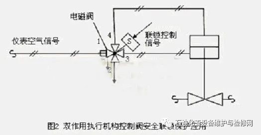 1.1.2雙作用執(zhí)行機(jī)構(gòu)控制閥安全聯(lián)鎖保護(hù)雙作用氣動(dòng)控制閥使用彈簧復(fù)位或無(wú)彈簧執(zhí)行機(jī)構(gòu),安全聯(lián)鎖動(dòng)作時(shí)關(guān)閉或打開(kāi)控制閥。其應(yīng)用如圖2所示。