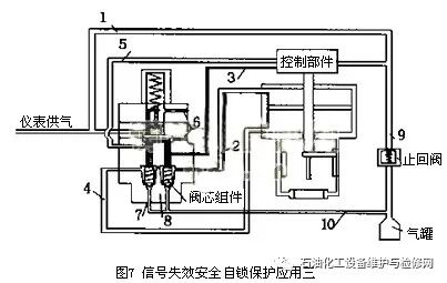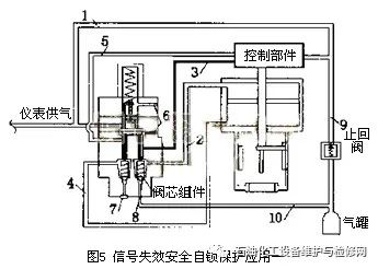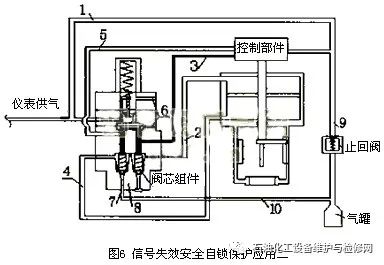 2.1.1信號(hào)失效氣動(dòng)控制閥全開(kāi)或全關(guān)安全保護(hù)在圖5中,1號(hào)管路為儀表供氣管路,2號(hào)管路為給氣缸頂部壓力的管路,3號(hào)管路為給氣缸頂部控制壓力的管路,4號(hào)管路為給氣缸底部壓力的管路,5號(hào)管路為給氣缸底部控制壓力的管路,6號(hào)為鎖定部件上下膜片來(lái)回運(yùn)動(dòng)的排氣口,7號(hào)為儲(chǔ)氣罐提供給氣缸底部的供氣口,8號(hào)為儲(chǔ)氣罐提供給氣缸頂部的供氣口,9號(hào)管路為儲(chǔ)氣罐提供給控制部件供氣壓力的管路,10號(hào)管路為儲(chǔ)氣罐提供給氣缸頂部或底部供氣壓力的管路。