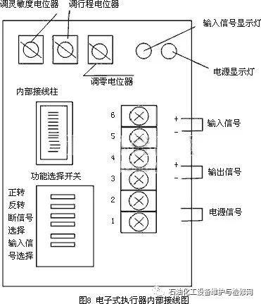 在以上的信號(hào)失效控制閥安全保護(hù)示意圖中,止回閥在信號(hào)失效時(shí),會(huì)保證儲(chǔ)氣罐的儲(chǔ)氣壓力輸送到氣缸的頂部、底部或頂部和底部。當(dāng)供氣壓力恢復(fù)到正常時(shí),止回閥恢復(fù)到原來(lái)的位置,以保證儲(chǔ)氣罐充滿所需要的氣壓,以備下次信號(hào)失效時(shí)繼續(xù)發(fā)揮它的作用。2.2信號(hào)失效電動(dòng)控制閥的安全保護(hù)電動(dòng)控制閥的關(guān)鍵部件在于其內(nèi)部樹(shù)脂澆鑄的控制器,其接受來(lái)自調(diào)節(jié)器的毫安或電壓信號(hào)和來(lái)自開(kāi)度檢測(cè)器的開(kāi)度信號(hào),將兩信號(hào)相比較并放大,向消除其差值的方向驅(qū)動(dòng)和控制電機(jī),其結(jié)果是使得來(lái)自調(diào)節(jié)器信號(hào)和開(kāi)度信號(hào)之間的偏差被減小,當(dāng)偏差消除時(shí)控制部分令電機(jī)停止在該位置上,達(dá)到調(diào)節(jié)和控制的目的。當(dāng)信號(hào)失效時(shí),輸出軸在相應(yīng)的時(shí)間內(nèi)仍處于運(yùn)轉(zhuǎn)狀態(tài),如果沒(méi)有相應(yīng)的控制措施,會(huì)停留在某一個(gè)位置,而失去對(duì)電動(dòng)控制閥的安全保護(hù)。根據(jù)工藝過(guò)程的需要,在電動(dòng)控制閥的設(shè)計(jì)選型和安裝過(guò)程中,就應(yīng)該注意到信號(hào)失效時(shí)電動(dòng)控制閥的安全保護(hù)。在圖8電動(dòng)控制閥電子式執(zhí)行器內(nèi)部接線圖中,信號(hào)失效時(shí)根據(jù)工藝過(guò)程的需要使閥門開(kāi)度仍然處于信號(hào)失效前的位置時(shí),將圖中的3和4斷開(kāi),接通5,就可以使輸出軸停止在原位置,使閥門開(kāi)度保持不變。
