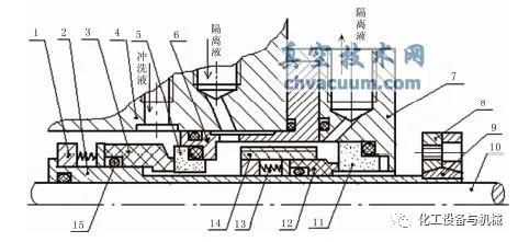 1-彈簧盒組件;2-軸套;3-動環(huán)Ⅰ;4-泵端蓋;5-靜環(huán)Ⅰ;6-靜環(huán)座;7-壓蓋;8-傳動環(huán);9-轉(zhuǎn)動圈;10-泵軸;11-靜環(huán)Ⅱ;12-動環(huán)Ⅱ;13-彈簧;14-泵送環(huán);15-O 形圈