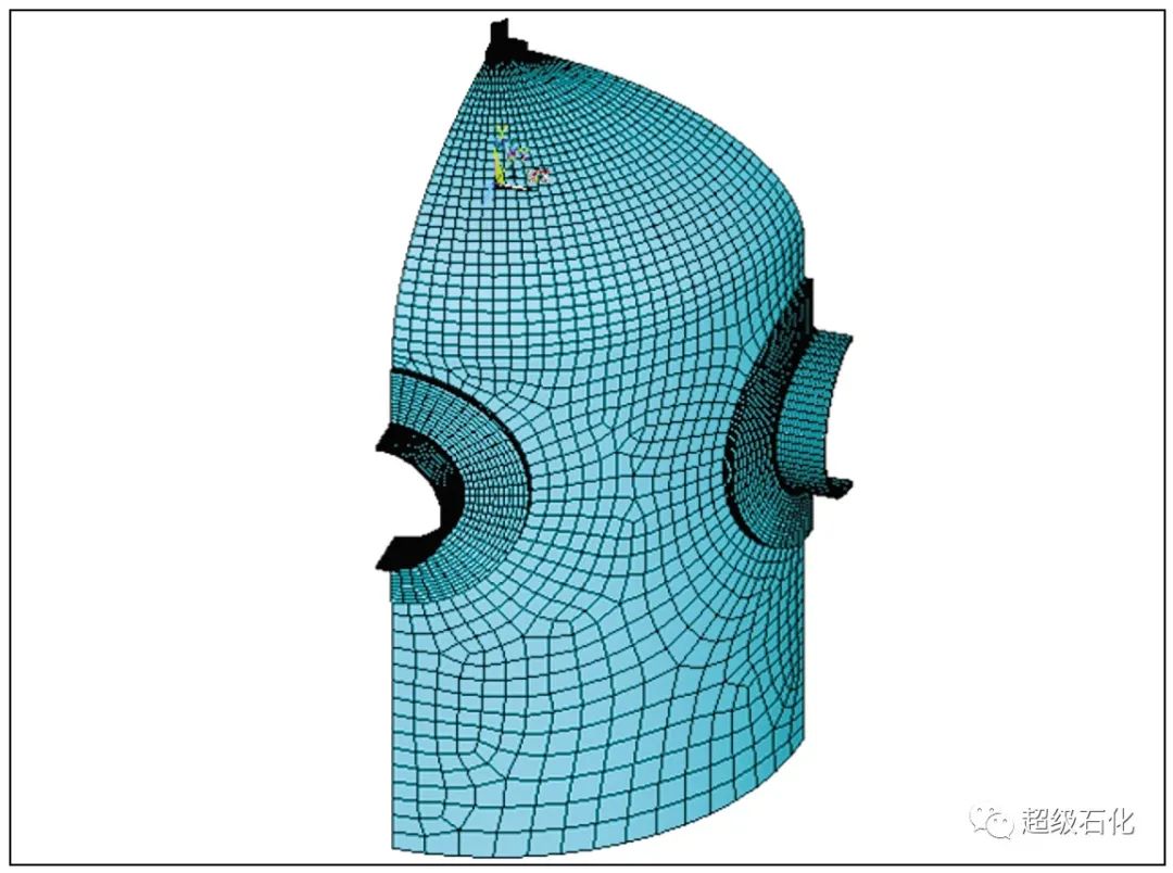 根據該旋風分離器幾何結構和工作載荷的對稱性進行建模和網格劃分,分析時可采用軸對稱模型進行應力分析,其中筒體的長度L為1 500 mm,筒體、封頭壁厚分別取計算壁厚23.3 mm、24.0 mm,上人孔、進口接管、出口接管壁厚選取實測最小值。分析時選用SOLID185模擬筒體和封頭等結構,采用映射面進行網格劃分,另外為了保證計算精度,沿筒體的壁厚方向劃分5層。該旋風分離器的應力分析模型及網格如圖1所示。
