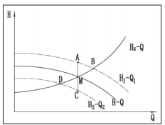 泵運(yùn)行工況點(diǎn)是由泵特性曲線H-Q和裝置特性曲線HZ-Q共同決定的。兩條的交點(diǎn)M即是泵的運(yùn)行工況點(diǎn),如圖1所示。